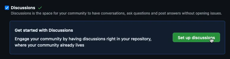 In the Features section, toggle the Discussions option to enable it for your repository. You’ll see a button labeled Set up discussions. Click on it to proceed.