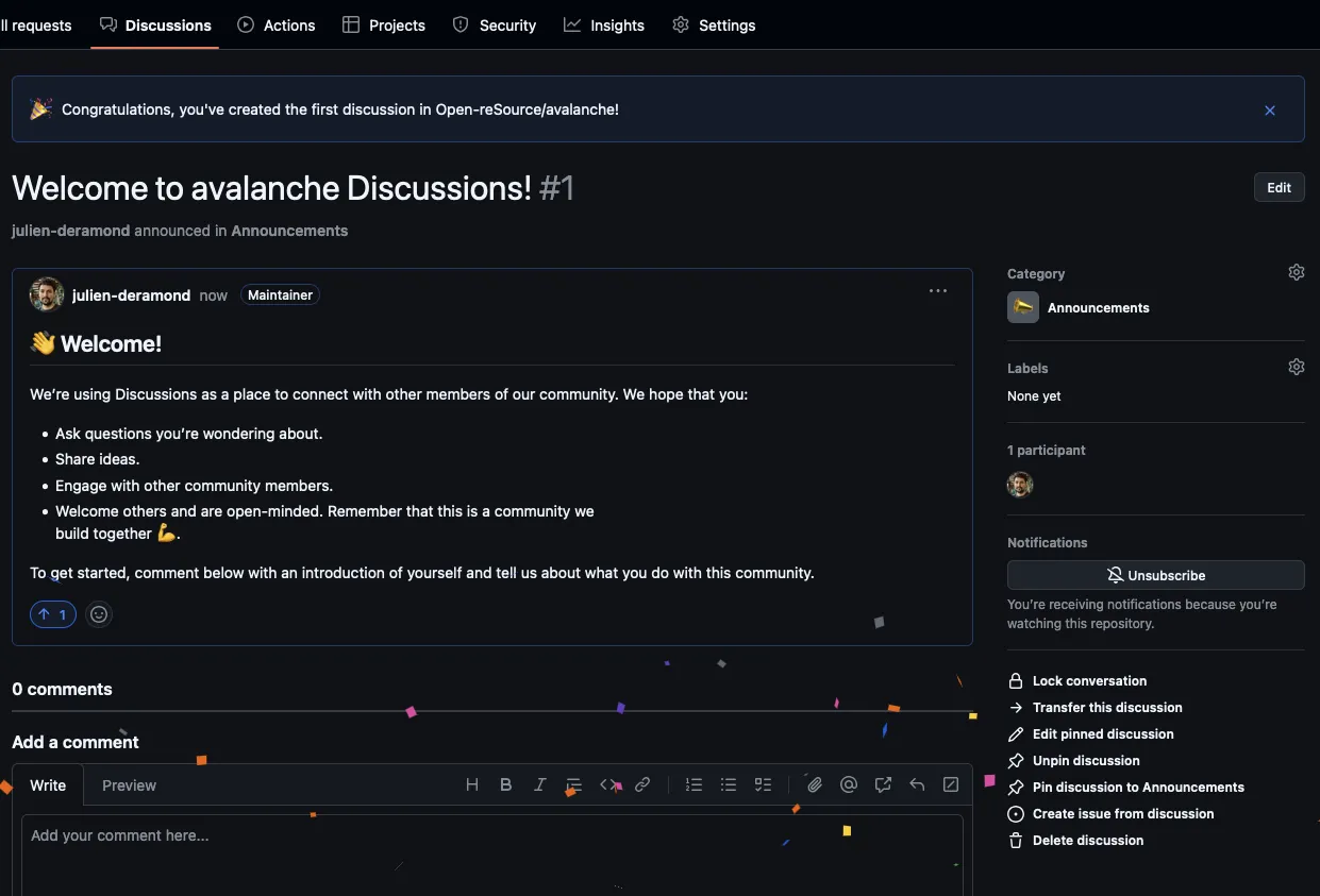 By organizing categories, seeding discussions, and actively participating, you’ve taken important steps to foster an active and engaging community around your project. A well-maintained discussion space encourages collaboration, drives innovation, and strengthens the relationship between maintainers and users. Keep the momentum going by regularly revisiting and improving your discussion space as your community grows.